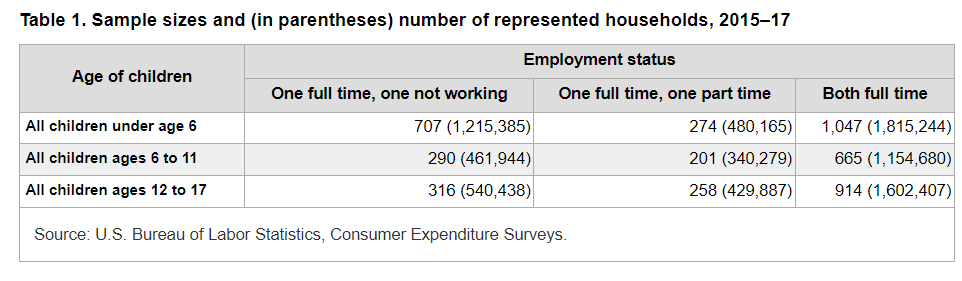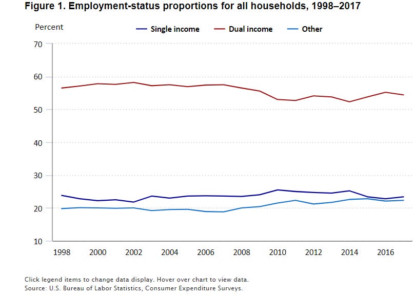 “CE data show that, among U.S. households, dual-income households have been a majority for at least the last two decades. The percentage of dual-income households was fairly stable between 1998 and 2017, ranging from 52 to 58 percent. (See figure 1.) In this article, a dual-income household is defined as one in which one spouse works full time and the other works at least part time.”