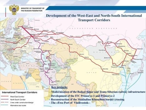 Additionally, the plans to expand and improve both the 9300 km Trans-Siberian Railway and its 4300 km southern Baikur-Amal Mainline rail being modernized, double tracked and integrated ever more deeply into Mongolia, China and even Japan. This dovetails the expanding International North South Transportation Corridor from Moscow to India via central Asia and Iran, which should now be seen as another dimension of BOTH the BRI and Far East Vision [see map below]. As the project advances, freight traffic along these rail lines will increase from 120 million tons/year to 180 million tons/year in 2024.