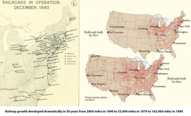 By 1860, that number had grown to 30,000 miles but a new quantum leap was effected by Lincoln’s decision to devote considerable resources during the height of the Civil War towards the construction of the Trans Continental Railway (built between 1863-1869). With the completion of this project, and the resolution of the Civil War (largely through the intervention of the Russians), rail growth and industrialization exploded. By 1880, over 93,000 miles of rail were laid, and when Gilpin published his Cosmopolitan Railway in 1890, the USA had over 163,000 miles of railway while many other nations were experiencing parallel growth through the application of this same model of political economy.
