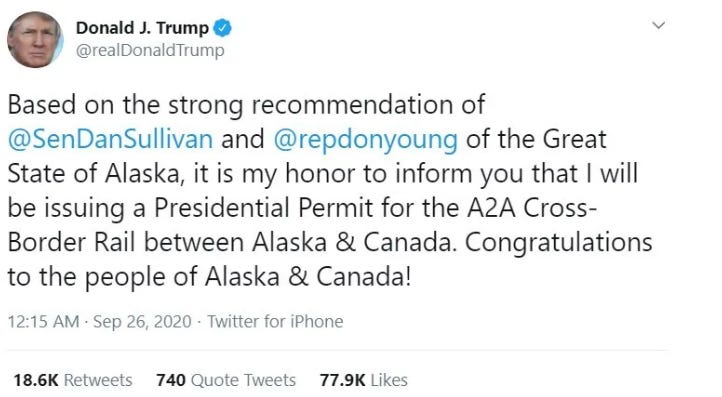 On September 26, 2020, President Trump announced that a long-overdue project would receive Federal support, which involves connecting Alaska for the first time with Canada and the lower 48 states via a 2,570 km railway.