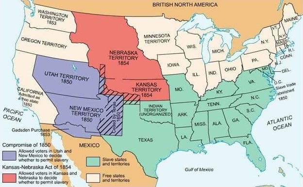 Between 1801 to 1840, southern cotton exports exploded from 100,000 bales/year to 1 million bales/year, with 80% of the exports going to Britain. The City of London-Wall Street-New Orleans triangle dominated the world system, with New Orleans representing over 12% of all U.S. banking capital. The southern slave states grew to represent the world’s fourth biggest economy through the support of the British Empire both financially and also in the logistical support needed to import mass slavery into the Americas. This degeneration proceeded slowly until the presidencies of Jackson and his handler Martin van Buren, but after this, cotton exports increased to 4 million bales/year by 1860, and the slave power grew immensely under the Kansas-Nebraska Act of 1854 that ensured the spread of slavery west of Mississippi.