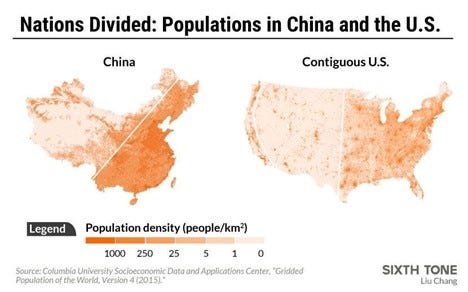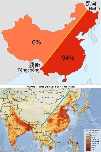 China faces similar problems, with its population density and developed sectors locked up not in the west, but narrowly along its eastern pacific coast. Nearly 94% of China’s population still lives in the east of the Heihe-Tengchong Line, with the vast inner heartland housing only 6% of the Chinese population.