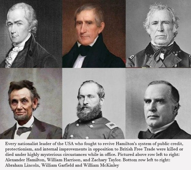 By 1836, the 2nd National Bank was officially killed after a mass propaganda campaign convinced a duped mob that it was an instrument of tyranny in America, and over the coming 6 decades, the only five presidents who would make any serious effort towards reviving America’s nationalist system would end up dead while in office (Harrison in 1841, Taylor in 1850, Lincoln in 1865, Garfield in 1880, and McKinley in 1901).