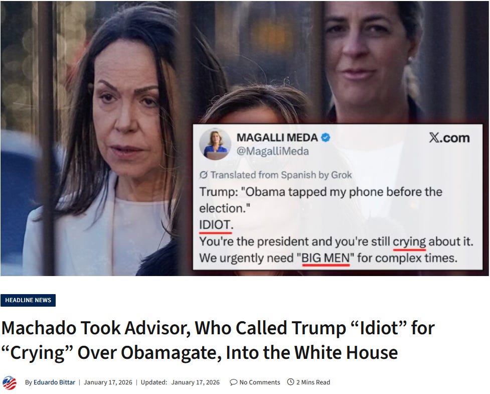 Meanwhile, an unverified political commentary claimed that opposition leader María Corina Machado brought an advisor into the White House who had previously insulted President Trump.