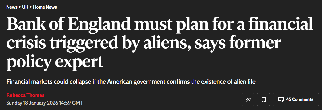 Could this be why the Bank of England suddenly announced a warning that financial markets could collapse if the US government decides to announce the existence of aliens.