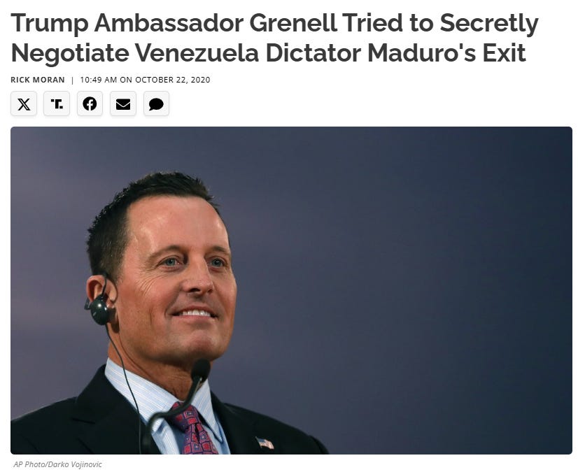 GhostofBasedPatrickHenry: There is a clear continuity of the Maduro plotline between the first and second Trump administrations, with Ric Grennel meeting Jorge Rodriguez— the brother to now acting Venezuelan President Delcy Rodriguez— in Mexico City in late 2020. That story was even reported at the time as Grennel trying to secretly negotiate an exit for Maduro, though I am unconvinced that was the real intent.
