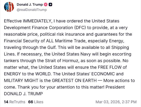 The move comes as Iranian attacks and threats to close the strait have triggered war-risk policies that froze tanker traffic, sent supertanker rates to all-time highs, and spiked oil volatility amid the ongoing U.S.-Iran war, instantly easing market fears of major supply disruptions.