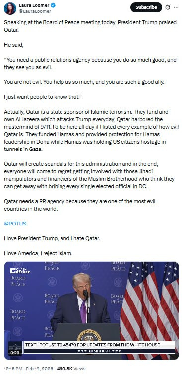 What about last week when President Trump hosted the first Board of Peace meeting in DC, and [indirectly] called out Laura Loomer and Mark Levin for their incessant attacks against Emir Tamim of Qatar?