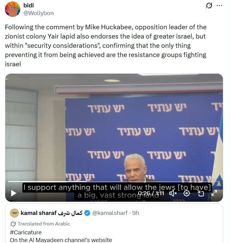 Lapid even went on (in Hebrew) to express empathy for the Greater Israel that Mike Huckabee conceptualized in his interview with Tucker.