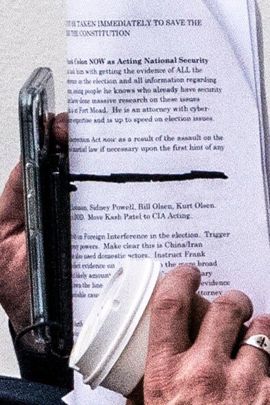 Olsen entered the election-related narrative in January 2021, when The Washington Post reported Mike Lindell at the White House meeting the President about the 2020 election. Lindell was holding a papers, and the photographers caught a glimpse: