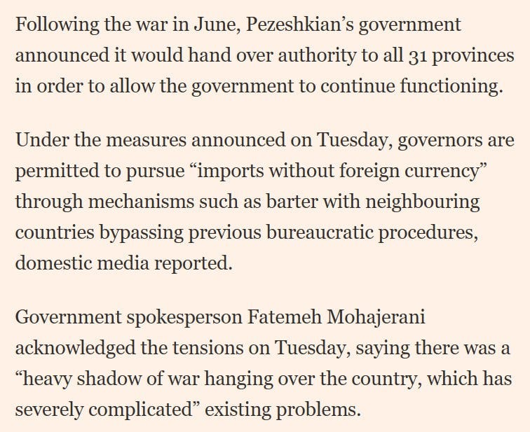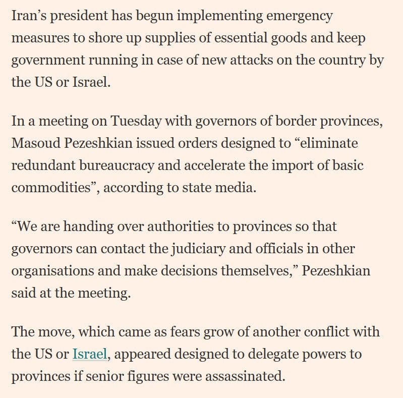 Iran has implemented emergency measures to ensure government continuity and essential supplies amid escalating threats of US or Israeli attacks, with President Masoud Pezeshkian delegating expanded powers to provincial governors for rapid decision-making, accelerated imports, and barter trade without foreign currency.