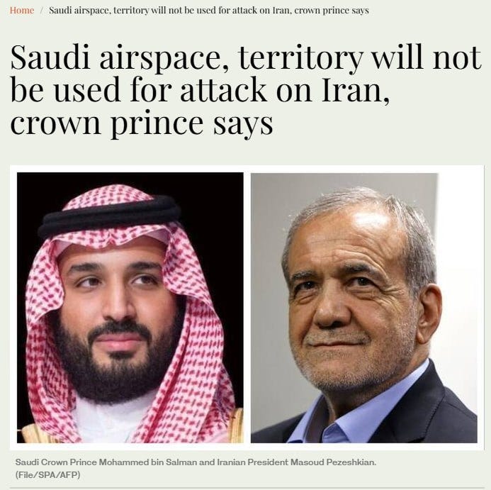 Immediately following this call between President Pezeshkian and the Crown Prince, Saudi Arabia announced that its airspace would not be used by any party to conduct operations against Iran.