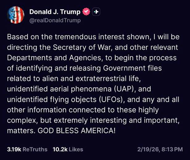“Based on the tremendous interest shown, I will be directing the Secretary of War, and other relevant Departments and Agencies, to begin the process of identifying and releasing Government files related to alien and extraterrestrial life, unidentified aerial phenomena (UAP), and unidentified flying objects (UFOs), and any and all other information connected to these highly complex, but extremely interesting and important, matters. GOD BLESS AMERICA!”