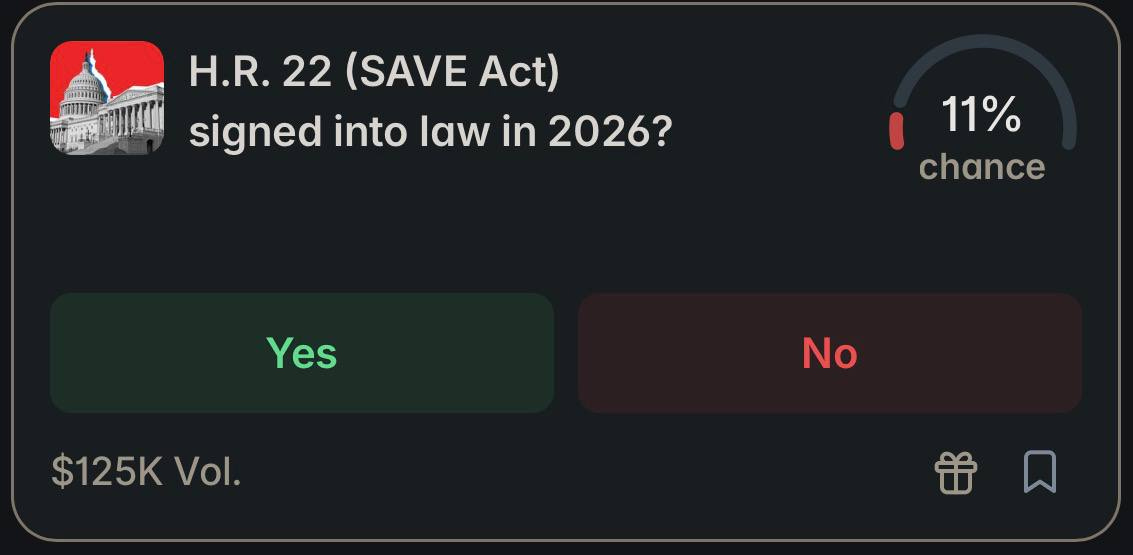 Polymarket had the act’s odds of becoming law in 2026 down to 11% over the weekend.