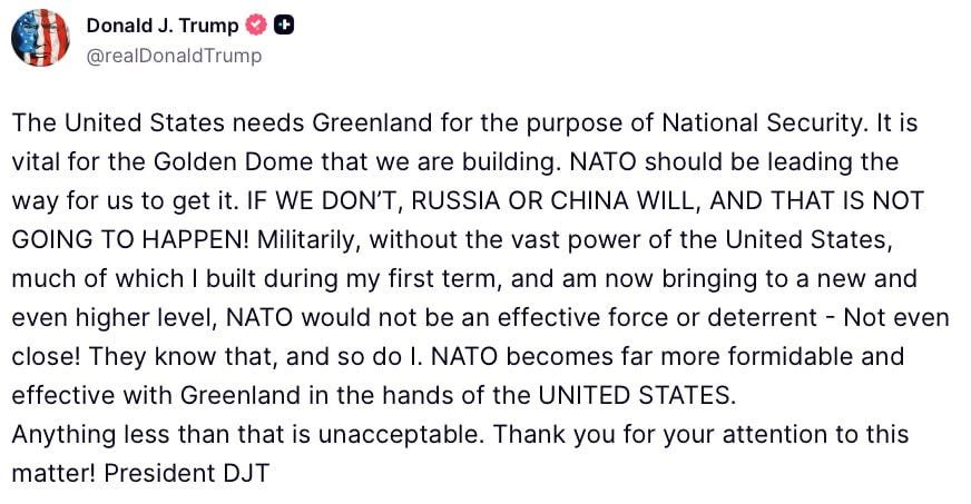 President Donald Trump posted on Truth Social stating that US control of Greenland is necessary for American national security.