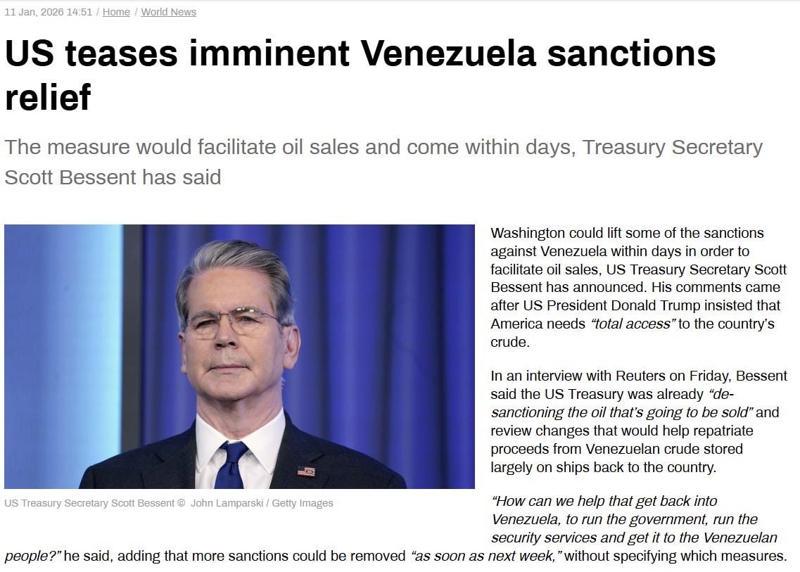 U.S. Treasury Secretary Scott Bessent told Reuters that additional U.S. sanctions on Venezuela could be lifted “as soon as next week” to facilitate oil sales and economic recovery, and that he planned to meet with leaders of the International Monetary Fund and the World Bank to discuss their re-engagement with the country.
