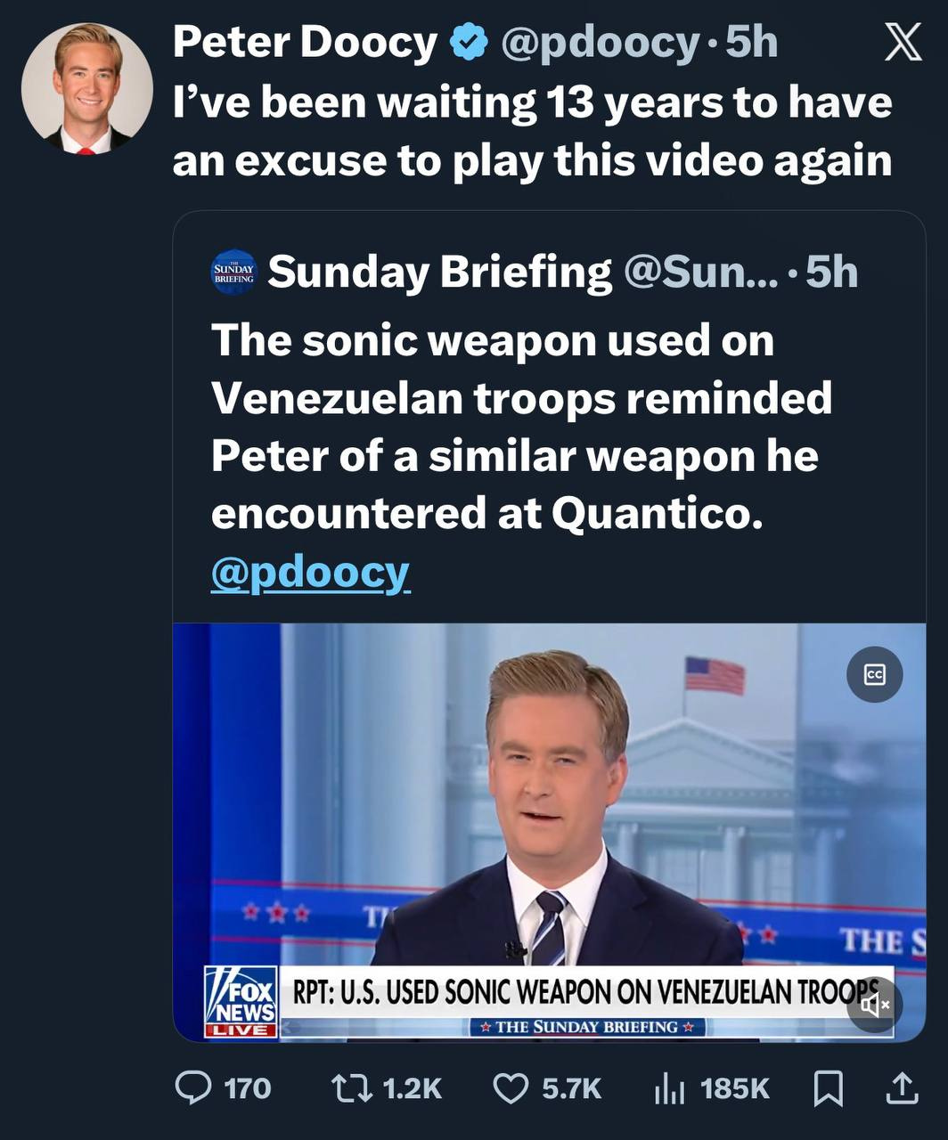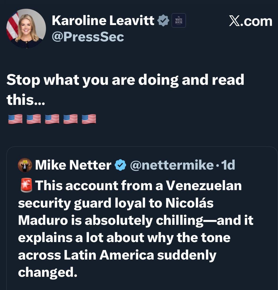 This story dropped Friday night and was instantly viral as, allegedly, a Maduro security guard recounted, in Spanish, a terrifying story of super soldiers and energy weapons. Early Saturday, WH Press Secretary Karoline Leavitt shared the story, amplifying its credibility.