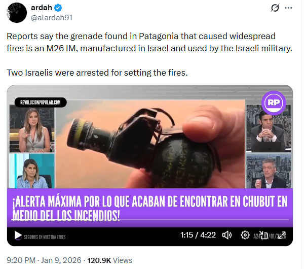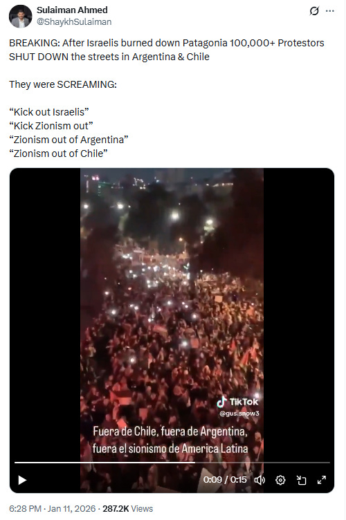 Social media is now saturated in videos of locals speaking to news reporters, claiming to have personally seen countless Israeli nationals wondering the area— many accusing them of starting the fires. As a result, there are now allegedly 100,000+ protesters in the streets demanding that Israeli nationals be expelled from Patagonia (Argentina and Chile).