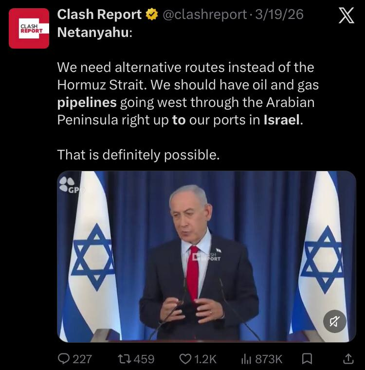 March 19: Netanyahu puts out statement suggesting that all oil pipelines from the Iraqi/Arab side of the Persian Gulf be run to Israel. (Many subsequently accuse Netanyahu of starting the Iran War to create the need for this solution.)