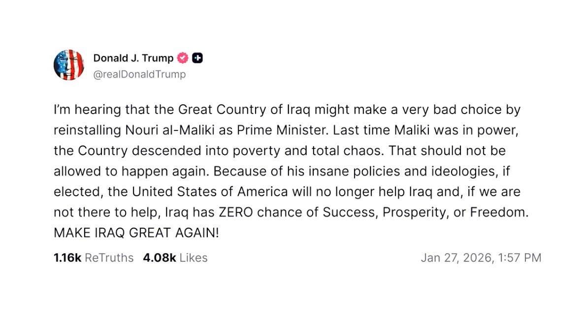 Remember two months ago when President Trump was attacking Iraq’s new government on Truth Social? Specifically Al-Malika, who is/was the favorite to emerge as Prime Minister?
