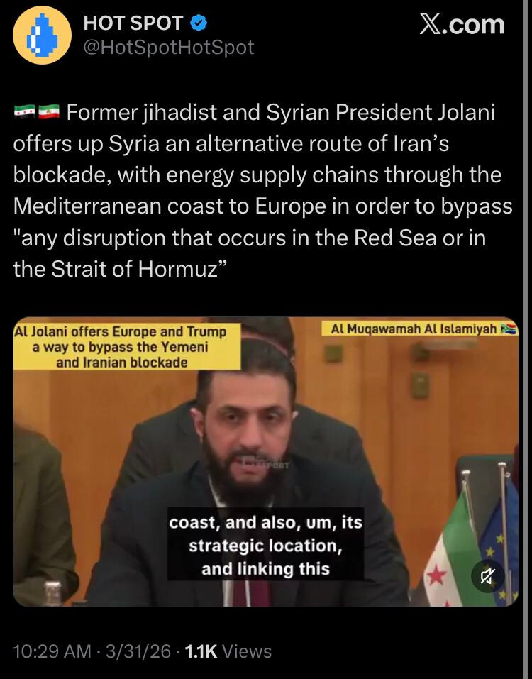 March 31: Syrian President Ahmed al-Sharaa (formerly al-Jolani) during a visit to Germany suggests that all pipelines from the Persian Gulf be run to Syrian ports. (Some already exist but have been abandoned.)