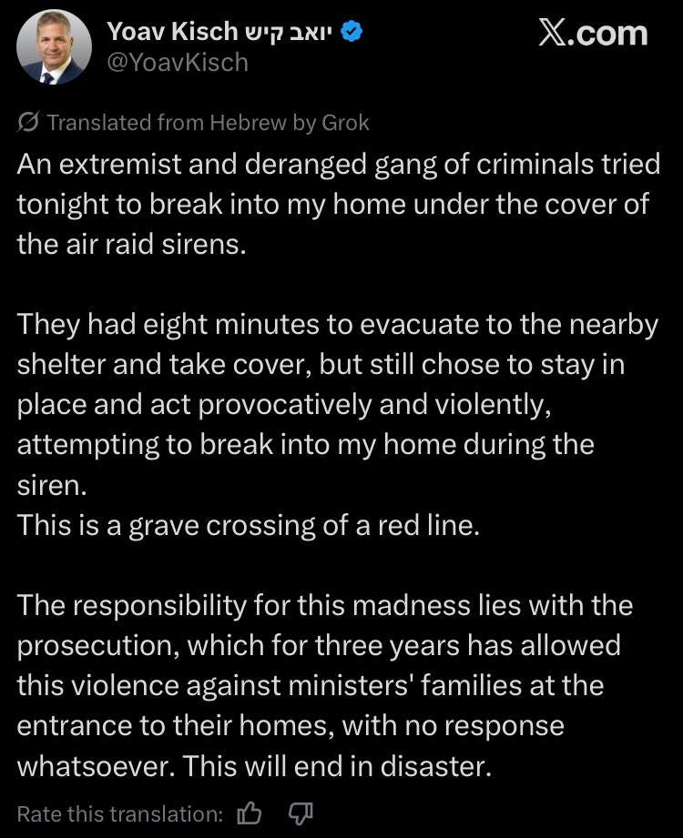 This video was posted by Yoav Kisch—Netanyahu’s Education Minister—with commentary that called the upset Israeli citizens “deranged criminals.”