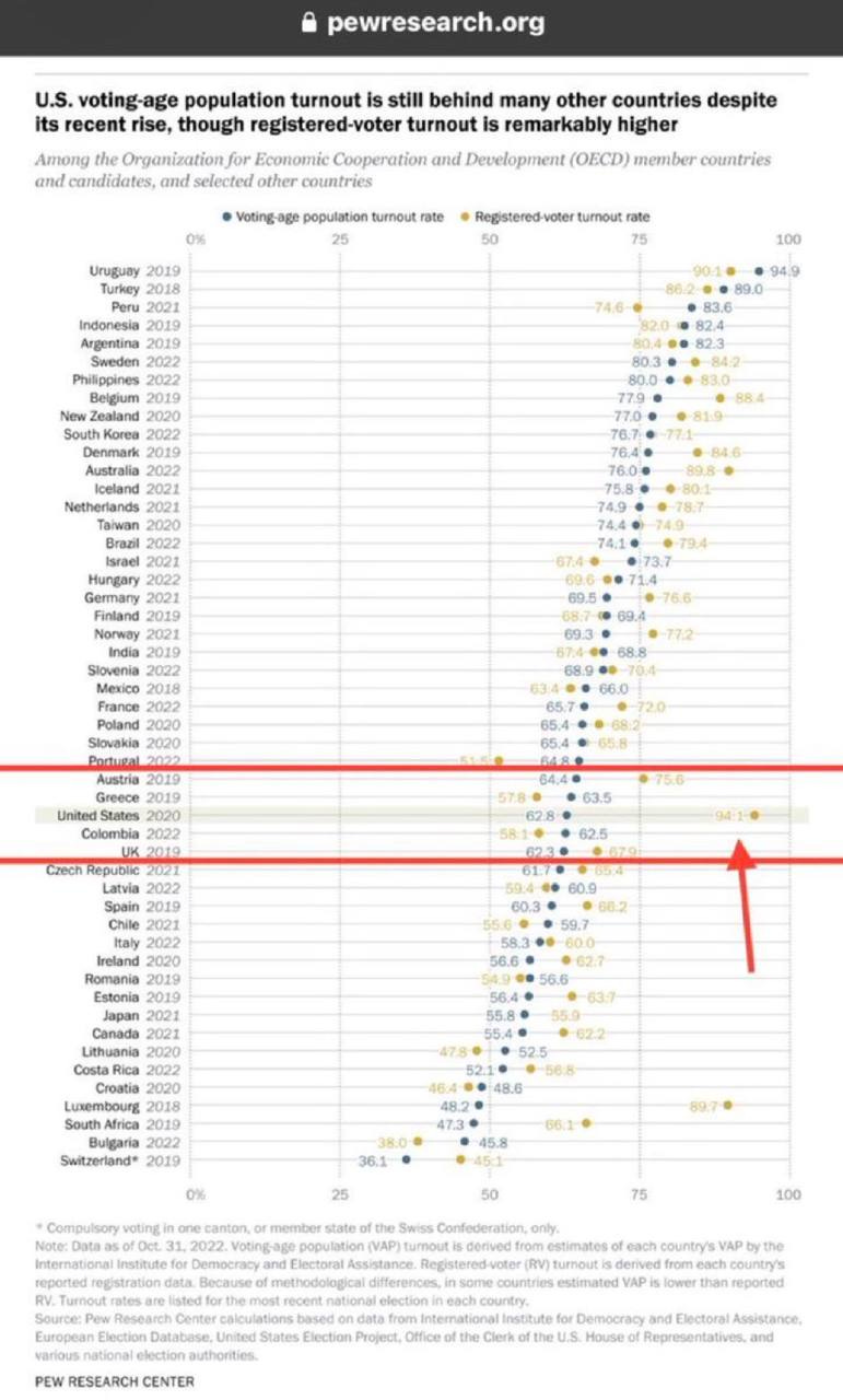 Presler’s premise is what always bugged me. 2020 voter turnout was 94.1% — a global outlier, according to Pew.