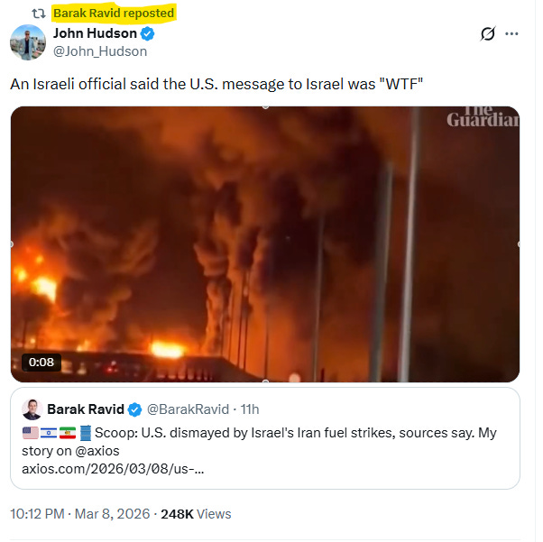 The Israelis have reportedly angered the White House after attacking 30 fuel depots in Iran without first notifying the White House in advance. The White House is concerned that these strikes targeted infrastructure that specifically serves Iranian civilians, which will cause unnecessary backlash while driving up the global price of oil. The precise message reportedly sent from the White House to their Israeli counterparts upon learning of the strike was, “WTF.”