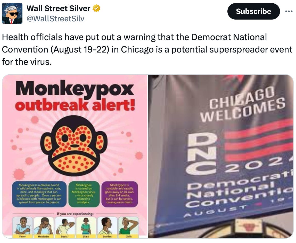 Julian was himself responding to a Wall Street Silver Tweet that went viral pointing out the obvious propaganda push for Monkeypox we’ve seen over the last few weeks … especially since some officials are now calling for the DNC in particular to be delayed or cancelled altogether for the betterment of public health.