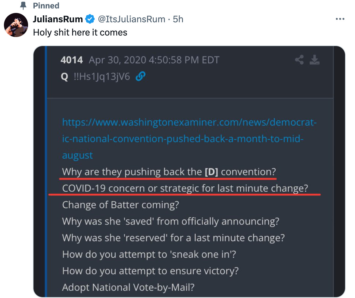 So, this isn’t so much a news item as a fascinating potential nugget unearthed by friend of Badlands Julians Rum, who was prompted to resurface a Q drop from 2020 regarding a last-minute change to the D Convention (ostensibly under the guise of Covid-19 measures, at the time,) now returned to relevance with the resurrected Monkeypox narrative.