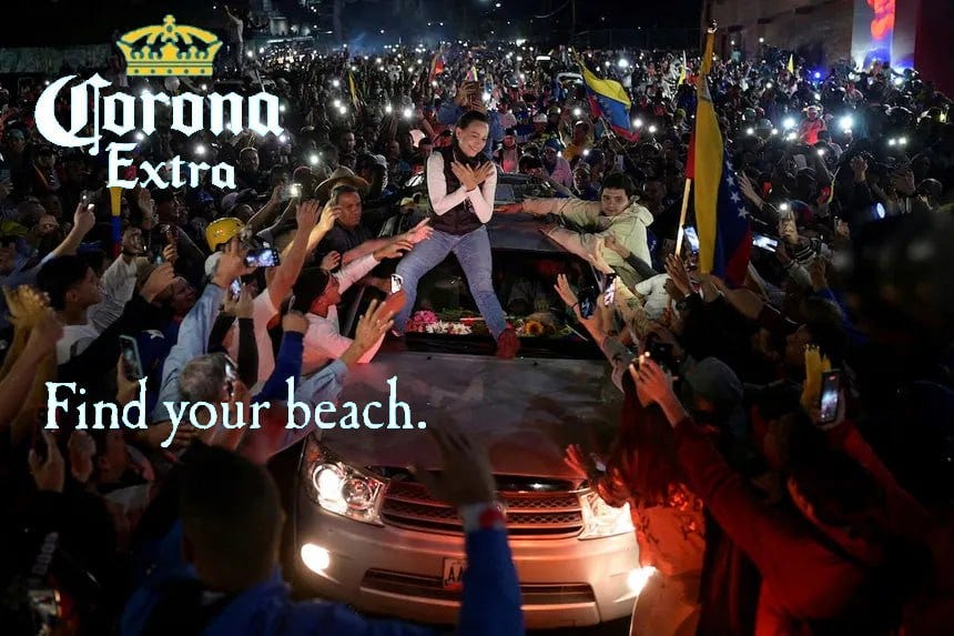 I’d like to end this take with some dank memes I made of the lovely Maria Corona Machado. Find Your Beachhead, and overthrow that government (brought to you by the National Endowment for Democracy).
