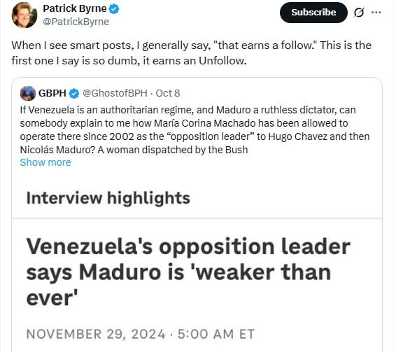 We must all take a moment to appreciate the fact that Maria Corona Machado’s entire online footprint is basically a Cinco de Mayo marketing campaign with poor branding. What I mean to say is that she has no bono fides to support the notion that she would be a qualified leader, and yet all of these simpering men online are frothing at the mouth for her to become the first female leader of Venezuela so she can legalize homosexuality, abortion, and transgender education. (All things that Maduro has outlawed and all things that she has actually promised to reverse.)