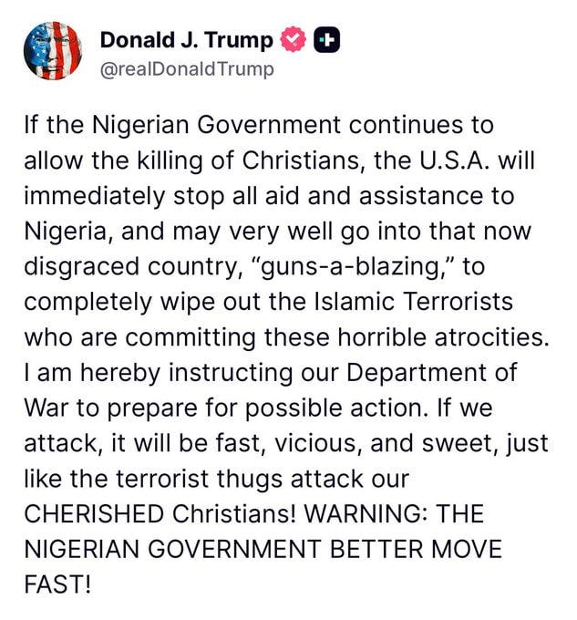 In a Truth Social post on Saturday, Trump accused Abuja of failing to protect Christians and warned the US “may very well go into that now disgraced country, guns-a-blazing, to completely wipe out the Islamic Terrorists.”