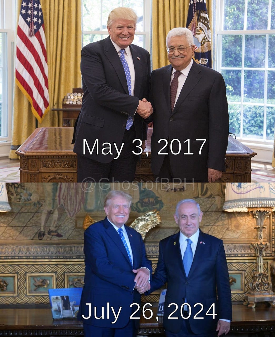 First thing you should note is that Trump wore the same tie in his [historic] 2017 meeting with President Abbas that he did in his meeting with Netanyahu on Friday. To me, that's not an insignificant detail—nor is the fact that the meeting with Abbas occurred 17 days before the Sword Dance.