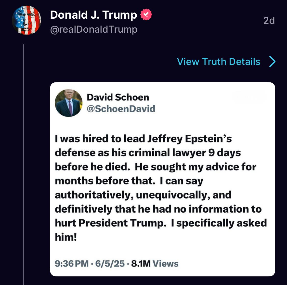 The remarks of Schoen, who was hired to represent Epstein shortly before his death, followed a post made by Elon Musk on X Thursday, in which Musk made a bold accusation against former President Trump amid growing tensions between the two over Trump’s “big beautiful bill.” – Silive.com