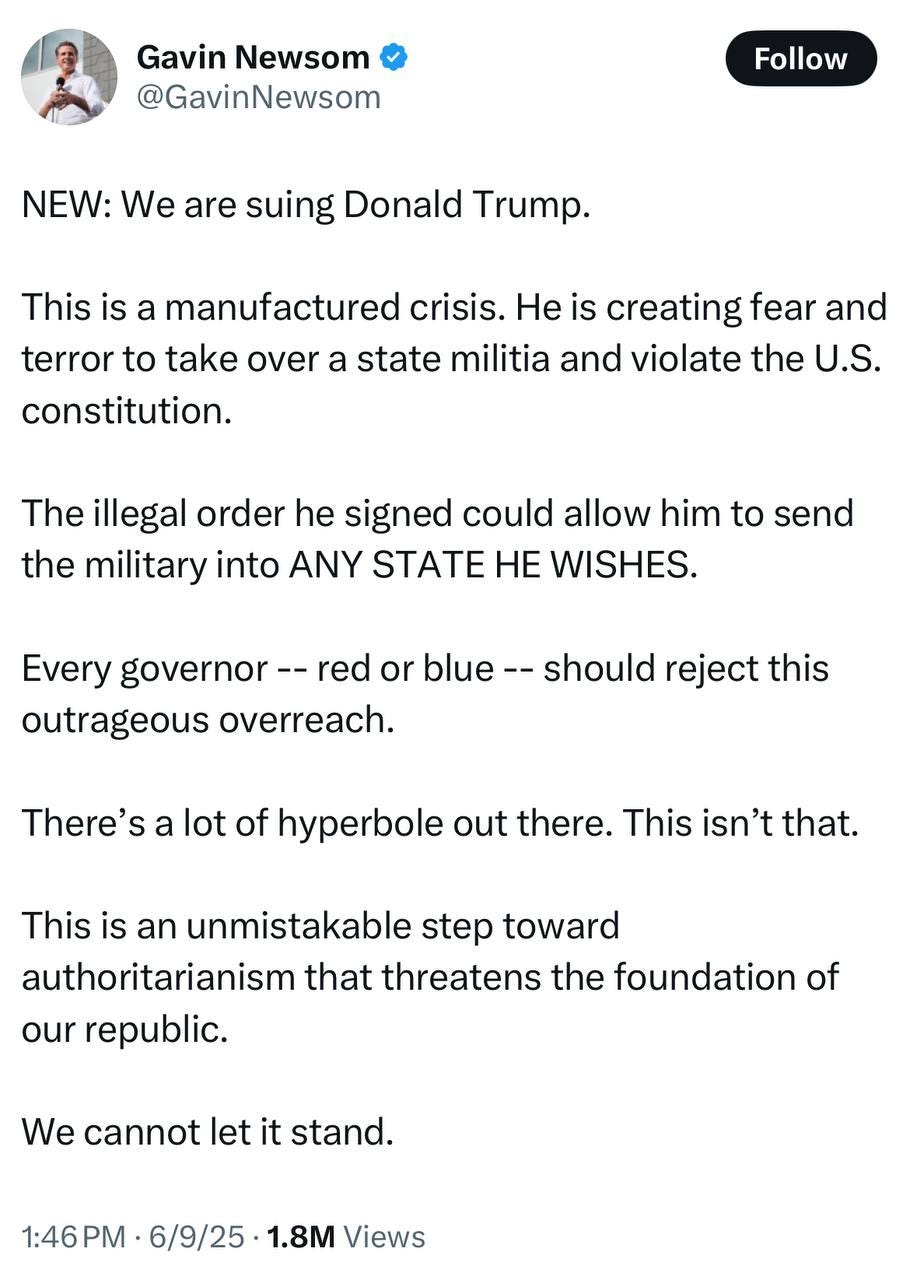 —-Jon’s got a good point, ‘Charge them all with insurrection and none of them can work in government again.’ Newsome (🤣) filing the lawsuit against the administration pretty much is the proof. Where’s the proof CA had the riots under control? 👀