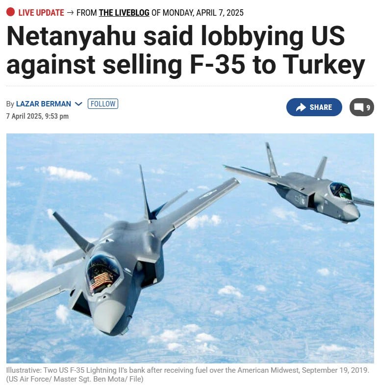 The reports from yesterday are that Netanyahu is lobbying Secretary of State Marco Rubio to block the reported sale of F-35 fighter jets to Turkey, which comes on the heels of last week's news of the Turkish Foreign Ministry accusing Israel of engaging in continued air strikes in Syria that are designed to destabilize the region.