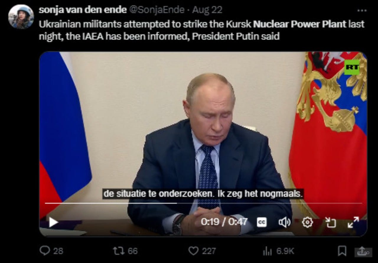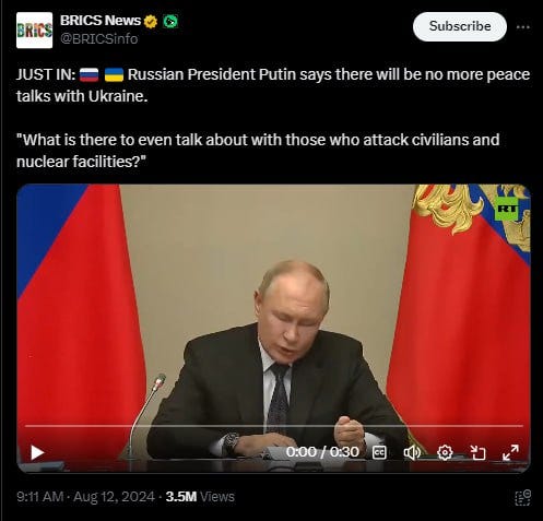 Finally, Putin has said that NATO is trying to strike the Kursk nuclear power plant at Kurskaya, which is DEEP in Russian territory. It seems unlikely, at this point, that Ukrainian ground troops will penetrate that far, though they do have the capacity to strike it with missiles—which they have apparently attempted.