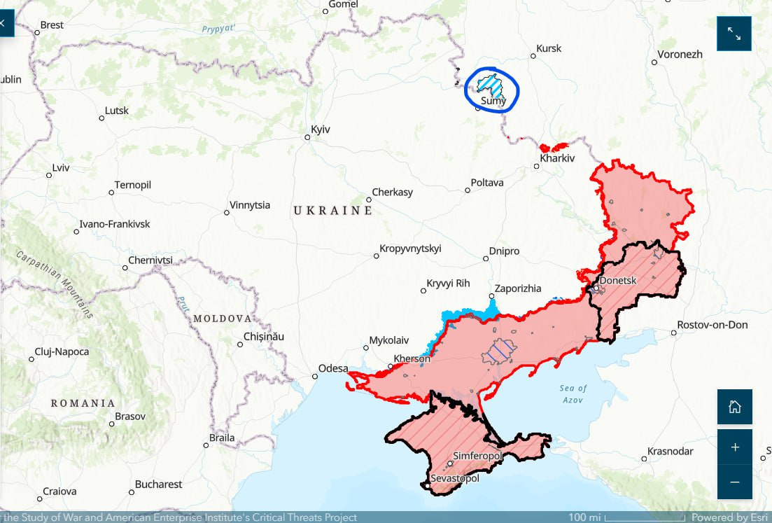 For context, here is where Kursk is located, relative to regions of Ukraine that are now under the control of Russia—where most of the fighting has taken place. (The Russian-controlled regions are shaded red. I have circled in blue where the Kursk invasion is taking place.)