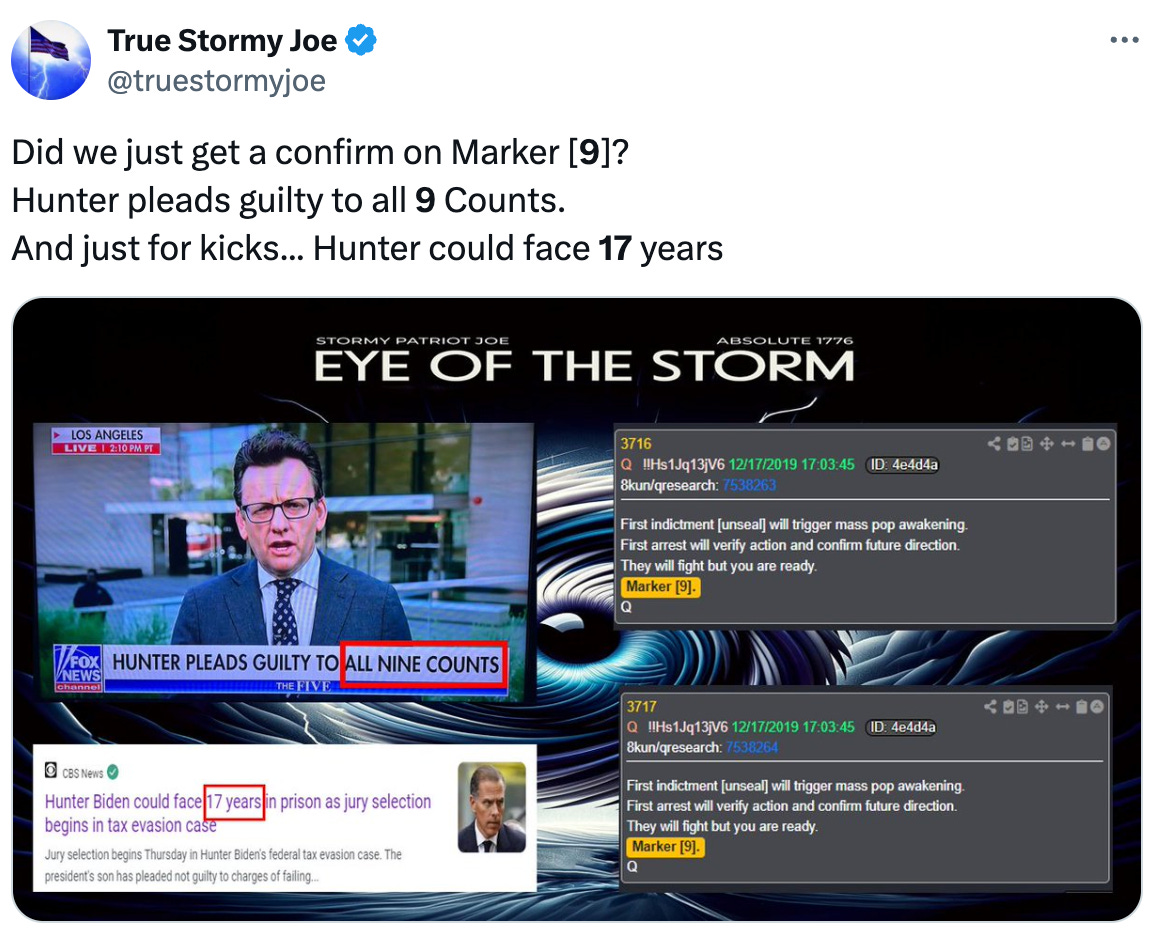 ’s reading of the Biden Crime Family, in that I believe they are and have been much more overtly controlled by patriots than others. There isn’t hard evidence to support this, but Hunter entering a “shock” plea deal that seemed to take his own Deep State lawyers by surprise on the eve of his trial certainly qualifies.There are any number of ways this could map and spiderweb, but from where I’m sitting, Hunter is doing something the machine did not expect, and if the machine did not expect it, I’m guessing patriots did.