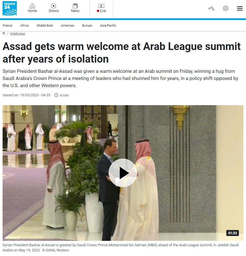 This all tracks, since MBS brought Assad and Syria back into the Arab League on May 19, 2023—eleven years after Secretary of State [Crooked] Hillary Clinton used her clout (blackmail files) to have them expelled in 2012.