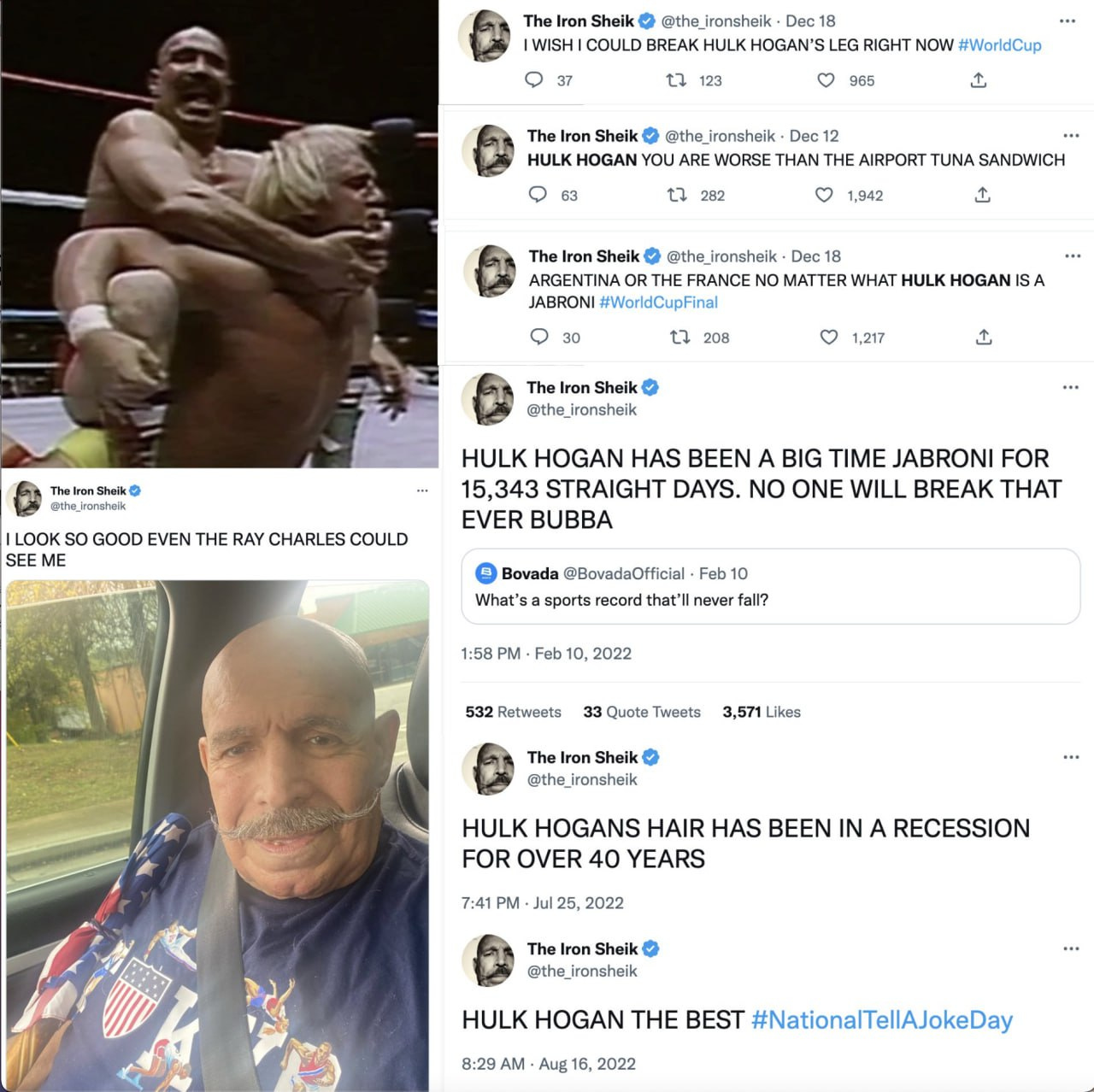 , who has had to upload a lot of images and videos for my takes this week. Obviously, his wrestler name would be "The Crown Prince," though I suppose if Hulk Hogan is in the mix, we could go old school and call him "The Iron Sheik." (The 1984 WWF World Heavyweight Championship fight between The Sheik and Hogan is considered by many to be the greatest match of all time. Hulk Hogan won.)PPS - After 39 years of rivalry, the Sheik still knows how to shit-talk Hulk Hogan. You love to see it. Pure kayfabe. (The Sheik died in June of last year, and Hogan gave a heartfelt tribute. RIP.) —