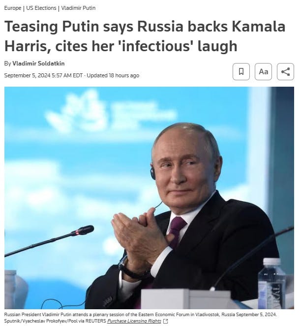 Teasing Putin says Russia backs Kamala Harris, cites her 'infectious' laugh