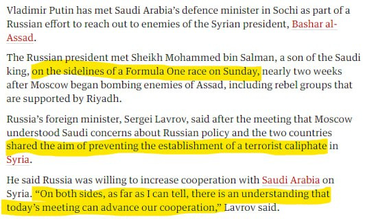 What's interesting about this 2015 article is that it really contradicts the old mainstream narrative that the Saudis opposed Syrian President Bashar al-Assad, and were helping NATO's attempt to overthrow him. (It also reveals that MBS is a Formula One fan...)