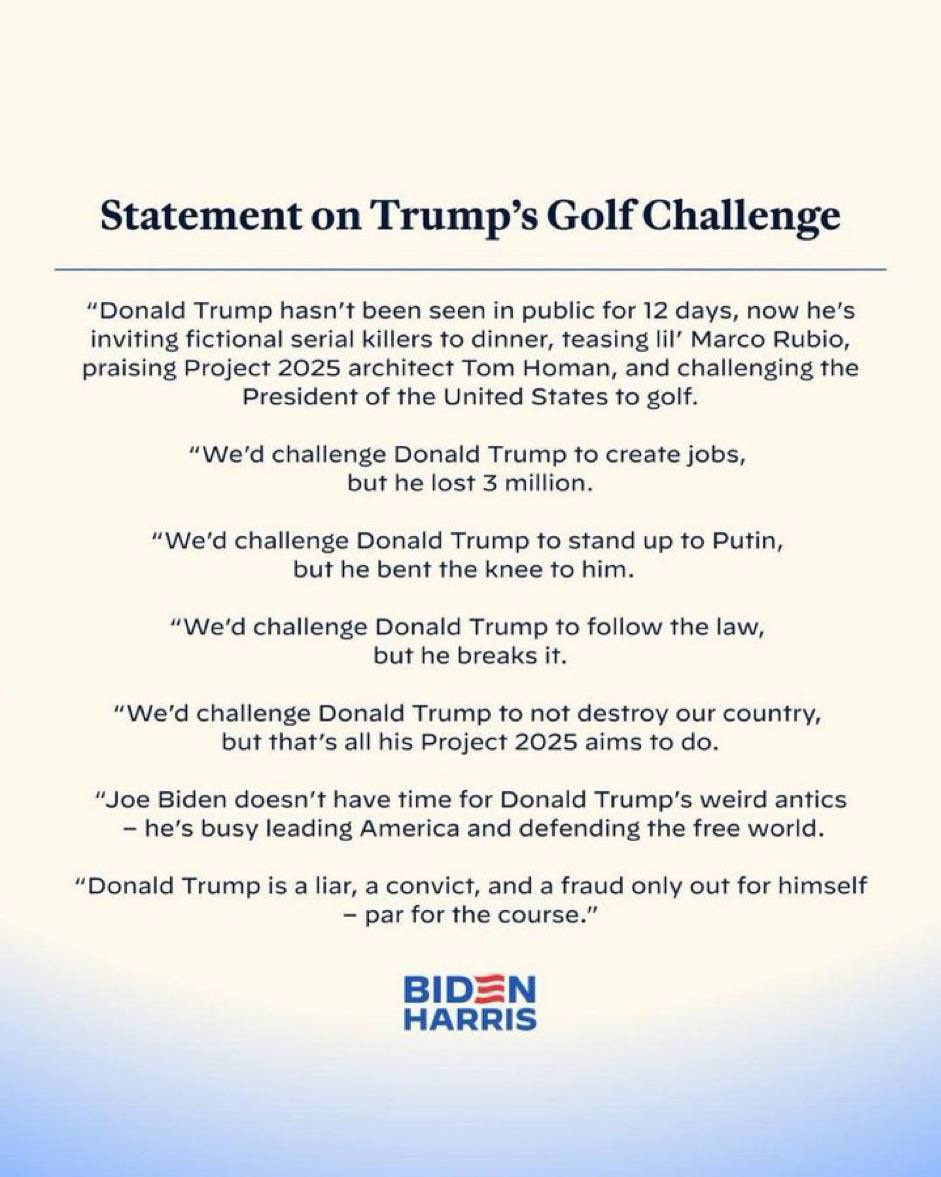 So, that was a lie. Late Tuesday, Biden issued a statement side-stepping Trump’s Tuesday golf challenge. He ignored the additional second debate challenge entirely. They did, however, take the opportunity to mention Project 2025, the left’s new super scary boogie man.
