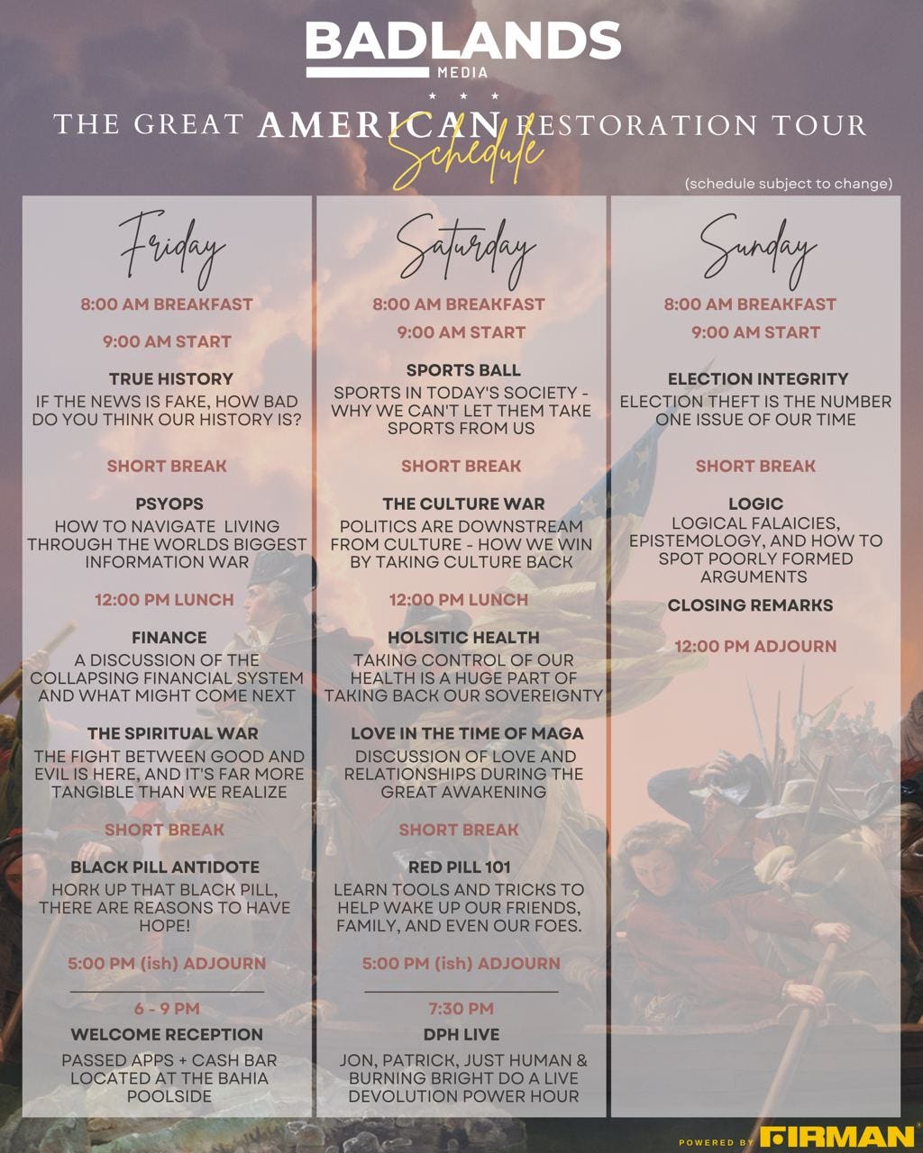Many of your favorite Badlands Media show hosts and substack writers will be holding group panels, Q&A sessions and all around mayhem over the course of the next three days in the desert.