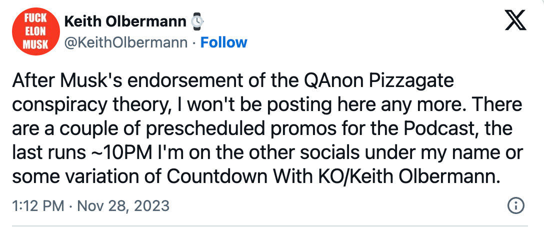 Keith Olbermann Has Glorious Meltdown, Leaving X Because of Elon 'Endorsement' of QAnon