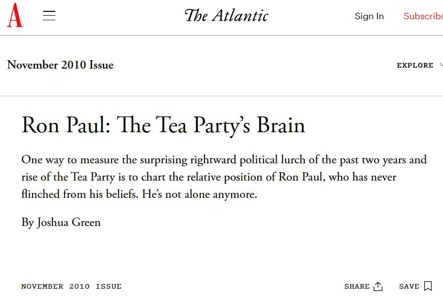 Here is a 2010 headline from The Atlantic acknowledging Ron Paul's role in the spiritual origins of the movement.