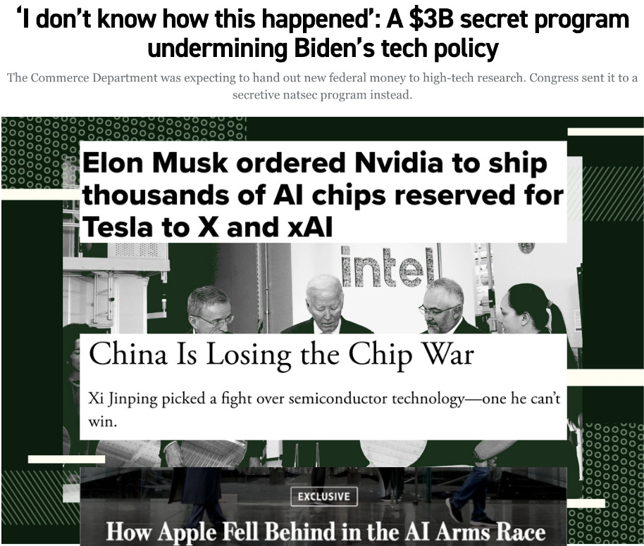 These headers have ranged from hit pieces on Xi Jinping, with the media championing the Biden Admin for the very trade war Trump kicked off, along with the CHIPS Act Trump first proposed and that Biden signed into law (a Devolution proof, if ever there's been one,) interspersed with the revelation that said Biden Admin has no idea why billions allocated to the CHIPS act is going to the DoD ... to admissions that Apple's push into the AI realm has fallen flat on its face