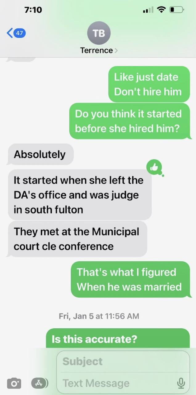 Bradley’s ‘absolutely’ is benign compared to some of these other messages. For example, according to Bradley, the affair began in 2020, ‘when she left the DA’s office and was a judge in South Fulton.’